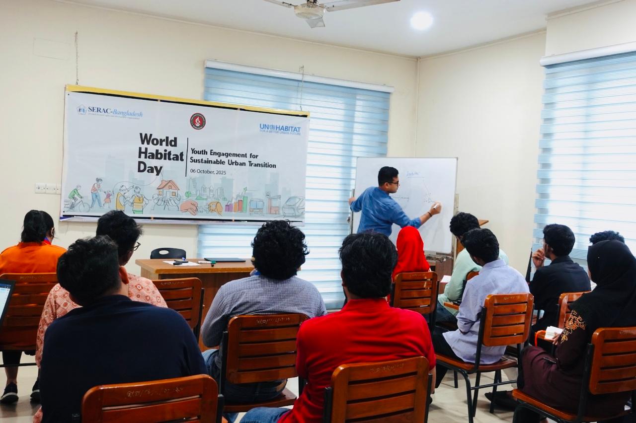 Today, on 6 October 2025, SERAC-Bangladesh observed a special event in Dhaka to mark World Habitat Day. The program was themed “Youth Engagement for Sustainable Urban Transition” in collaboration with UN-Habitat and Bangladesh Urban Youth Council Network through the SHIFT Project.